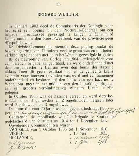![]() Koninklijke Marechaussee Brigade Wehe. ![]() De brigade Wehe werd uitgezet op 1 oktober 1905 en opgeheven op 1 maart 1943.