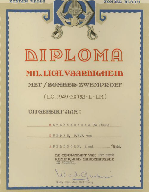 De sportieve marechaussee W. van Dalen getuige deze sportdiploma's.