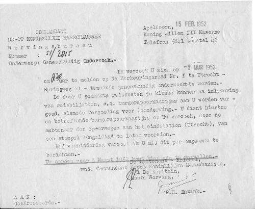 Oproep geneeskundig onderzoek voor in dienst Kmar 1952.
